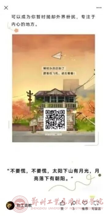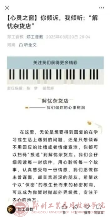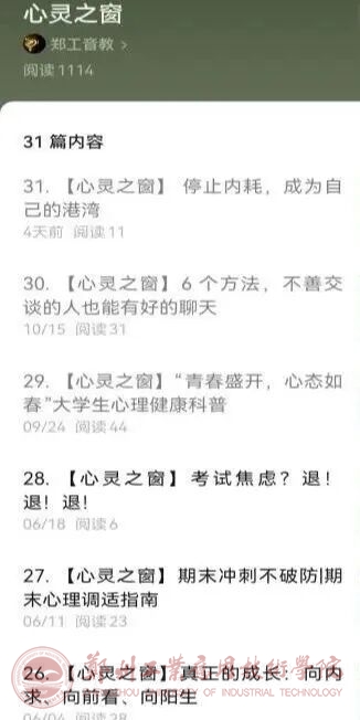 线上平台:依托“郑工音教”微信公众号,开设“心灵之窗”“解忧杂货铺”等专栏,定期推送心理健康文章,2025年累计发布心理健康相关推文31篇,覆盖学院全体学生。